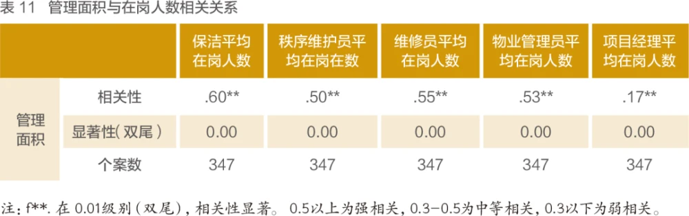 分析住宅物业服务费水平与各岗位平均到手收入的相关性(表12),除保洁和项目经理其相关关系为弱相关外,其他维修员、秩序维护员、物业管理员为中等相关,其相关关系程度依次降低。较高的物业服务费水平能给员工带来一定幅度的收入收益。