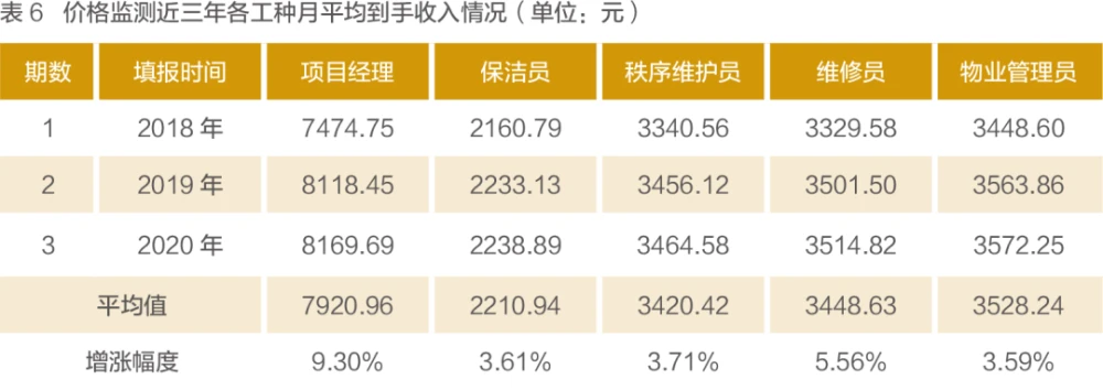 近3年各工种月平均到手收入稳定增长(表6),增长幅度最大的为项目经理,为9.30%,其他依次为维修员、秩序维护员、保洁员、物业管理员,对应幅度为5.56%、3.71%、3.61%、3.59%。2020年较2019年,各岗位人员月均收入均有上涨,其中保洁员收入增加最少,为5.76元,维修员、秩序维护员及物业管理员月均到手收入分别增加13.32元、8.46元和8.39元。项目经理月均收入上涨最明显,增加51.24元,同比增长0.63%。