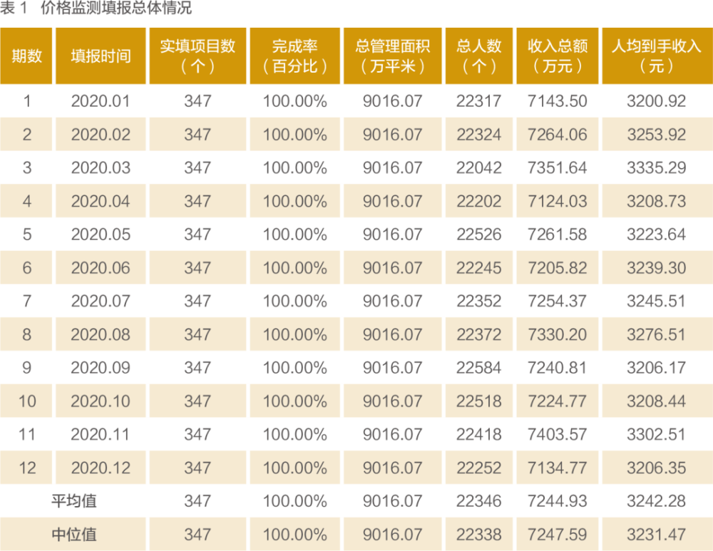 2020年全年物业管理行业价格监测填报总体情况(表1)良好,数据填报率为100.00%,月均监测人数22346人,人均到手收入3242.28元/月,较上期3138.85元,同比上涨3.3%。2016-2020年数据填报率约为100%。2016年人均到手收入2784.4元/月,整体来看,人均收入稳步增长,复合增长率为3.88%。