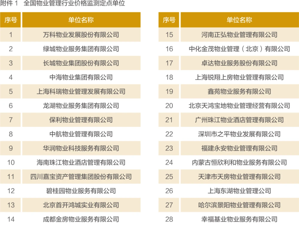 全国物业管理行业劳动力市场价格监测定点单位从中国物业管理协会会员中确定28家企业作为价格监测定点单位(附件)。