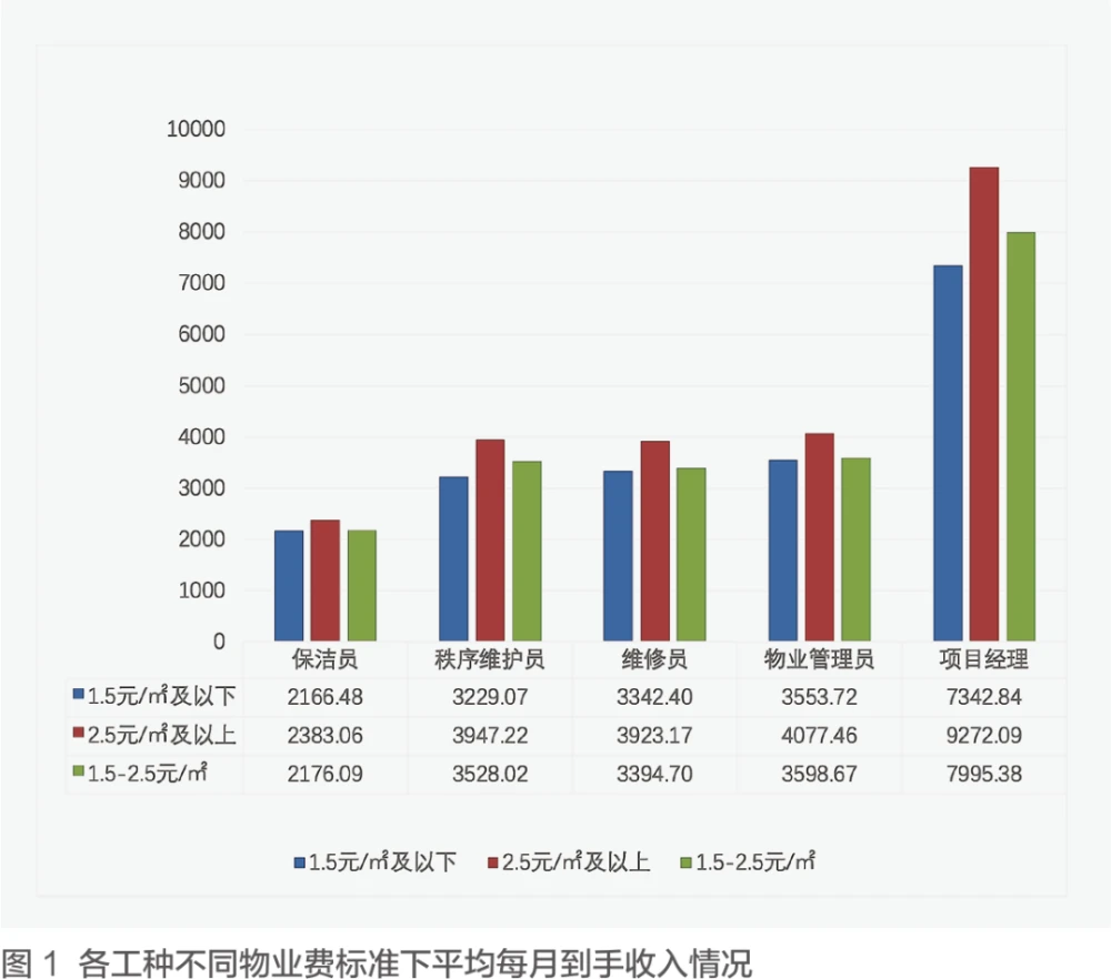 从物业费的标准,对347个价格监测项目进行了划分,其中1.5元/(平方米·月)及以下的监测项目143个;1.5-2.5元/(平方米·月)的监测项目119个;2.5元/(平方米·月)及以上的监测项目85个;从各工种不同物业费标准下平均每月到手收入情况(图1)可以看出,随着物业费标准的提高,不同工种员工到手收入均有提高,其中,项目经理工资提高最为明显。