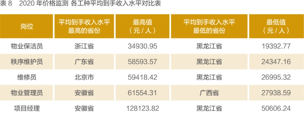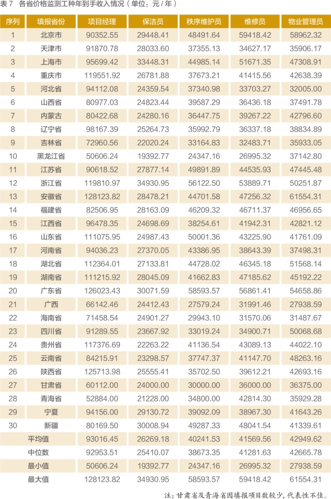 通过各省价格监测工种年到手收入情况(表7)可以查看30个省(市、区)2020年1月至2020年12月各工种到手年收入的详细金额: