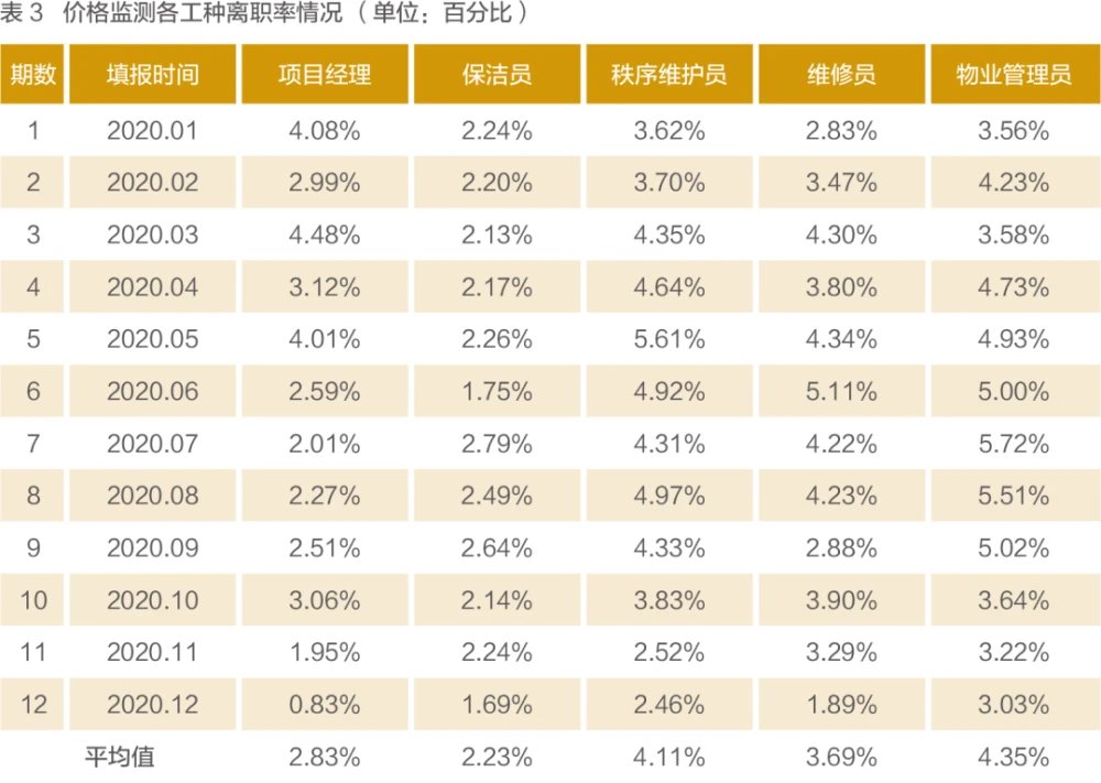 统计近3年各工种平均离职率情况(表4),物业管理员最高,为4.58%,保洁员最低,为2.32%。