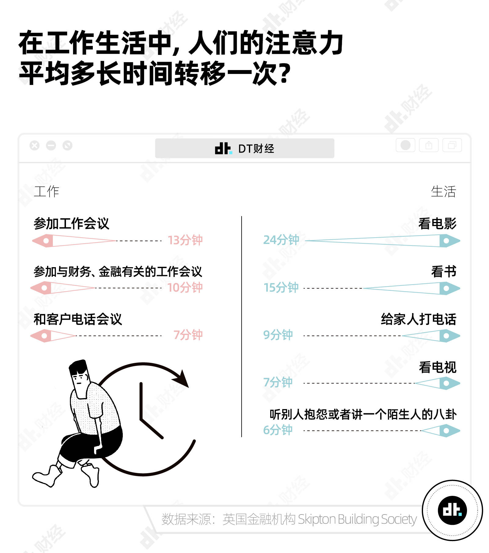 2018 年,英国金融机构 Skipton Building Society 在调查中发现,人们的注意力平均 14 分钟就会转移一次,具体到各种事情:开会 13 分钟就开始走神,如果是和财务、金融有关的会议或谈话,这个时间会缩短到 10 分钟;和客户打电话会议的时候,7 分钟就会分心,开始管不住手地查个邮件什么的……