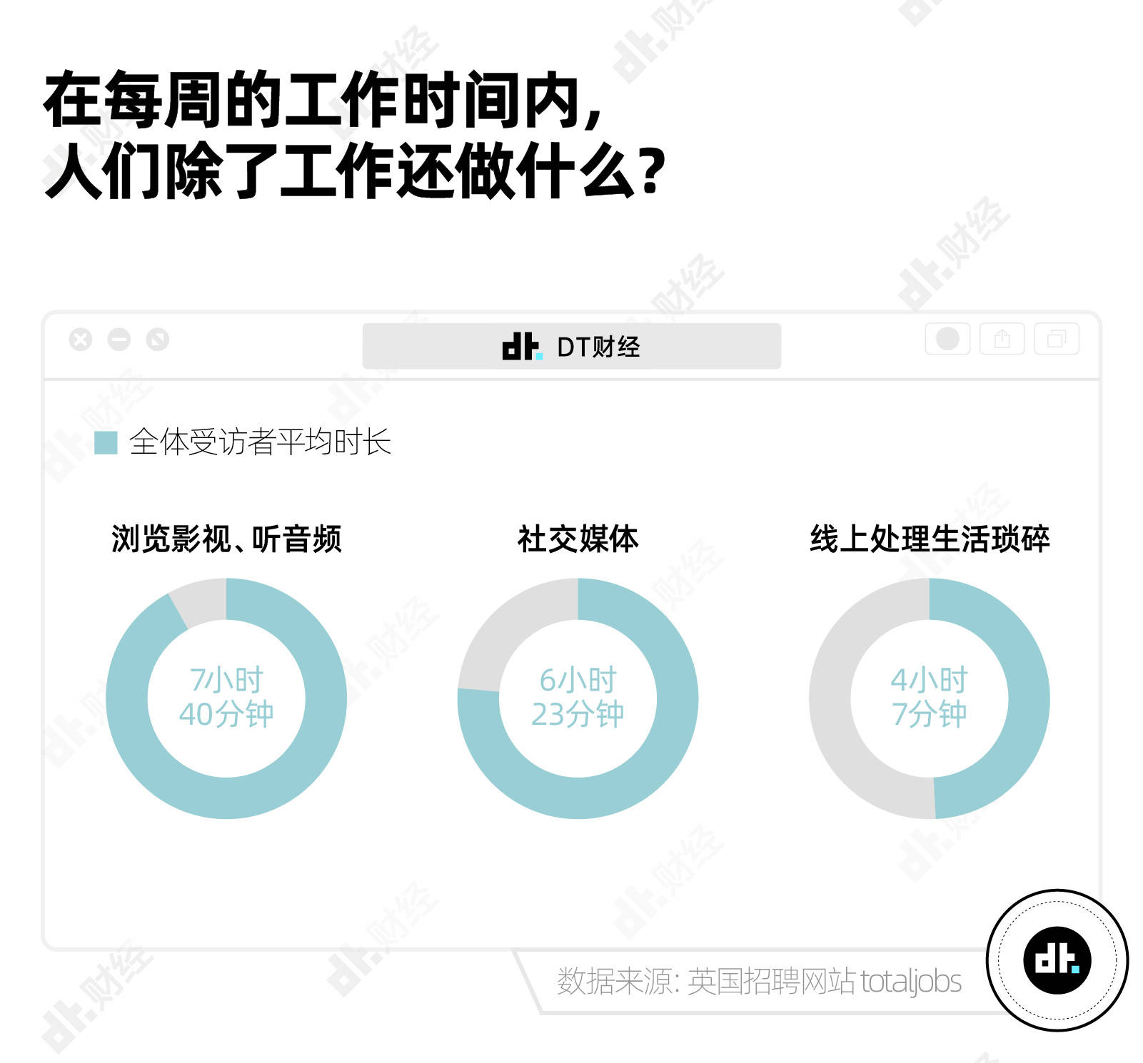 2018年英国的一家招聘网站 totaljobs 调查了近七千名上班族,他们发现,以一周为单位,受访者们上班时会花六个多钟头刷社交媒体、约四个小时在线上处理各种生活琐事,看视频和听音乐(不管是娱乐还是工作需要)就更久了,林林总总加起来有七个多小时。