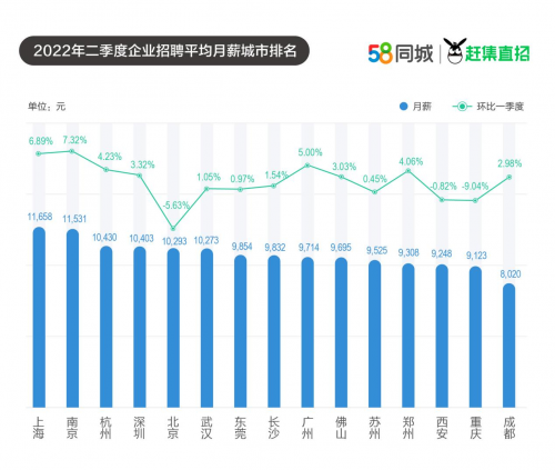 值得注意的是,上海受特殊环境影响,在二季度经历了大面积停产到有序复工,人才产生较大流动。为加速复产复工,上海企业给出了较高的薪资待遇,企业招聘薪资位居首位,平均招聘月薪为11658元。此外,南京、杭州、深圳、北京、武汉平均招聘薪资也超过10000元。总体来看,2022年二季度,全国整体平均招聘月薪同比上升0.89%,为9283元。