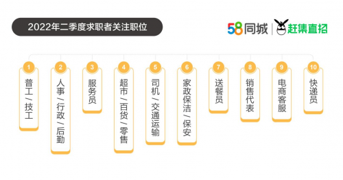 二季度,求职活跃度TOP10职位分别为:普工/技工、人事/行政/后勤、服务员、超市/百货/零售、司机/交通运输、家政保洁/保安、送餐员、销售代表、电商客服、快递员。其中,电商客服、服务员类职位求职投递环比增幅较大。可见,重技能、凭实干、多劳多得的“一线”岗位,更受求职者的青睐。