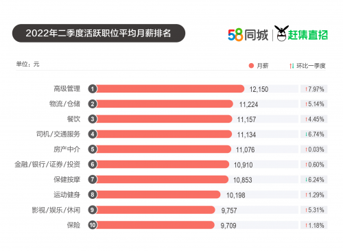 从收入上来看,物流/仓储类、餐饮、司机/交通服务、房产中介、金融/银行/证券/投资、保健按摩、运动健身职位均在二季度实现月入过万,其中,受夏季瘦身消费需求激增影响,运动健身职位月薪同比增长最快,增幅为10.04%,环比一季度上升1.29%,达到10198元。不过,重人脉、看资历的高级管理类职位薪资则更胜一筹,平均招聘月薪为12150元。