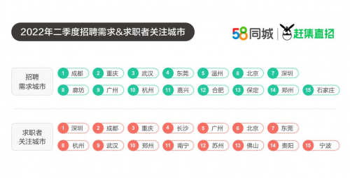 在用工需求方面,随着二季度疫情得到有效防控,一系列援企纾困政策举措效果正在显现,经济回升带动各城市用工需求激增。根据2022年二季度人才流动报告显示,成都、重庆、武汉、东莞、温州、北京、深圳、廊坊、广州、杭州等城市招聘需求旺盛,各城市企业的发展信心、经营预期正在企稳转强。