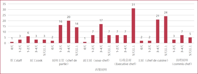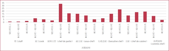 **再者,工作时间长。**52%的厨师每天需要工作8~12个小时,10%的厨师工作12个小时以上。